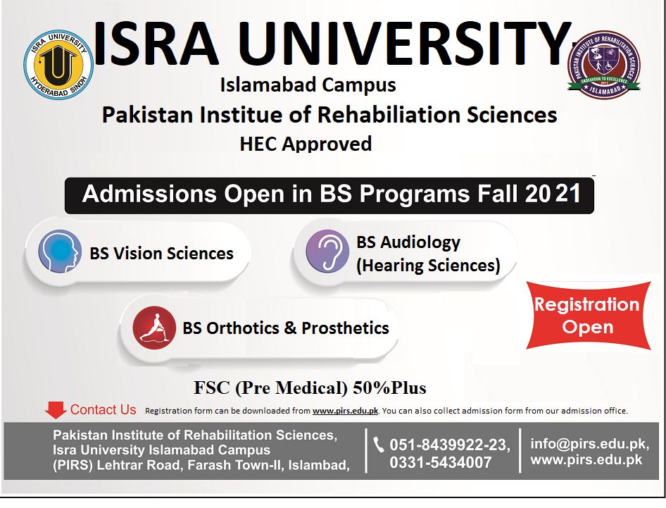 The Pakistan Institute of Rehabilitation Sciences (PIRS) in the premises of ISRA University Islamabad Campus. The Goal of the PIRS is Establishment of Cross-Disability Institute integrating available teaching resource, knowledge and skills in multiple disciplines (vision sciences, audiology, physical rehabilitation and mental health) for producing trained and well-informed human resource addressing the issues of having an Inclusive Society.